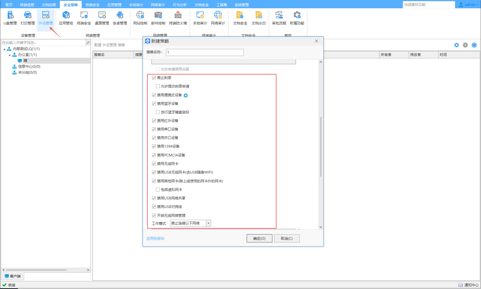 可以禁止终端电脑使用光驱、刻录机、手机便携式设备、无线网卡、蓝牙设备、红外设备、串口设备、并口设备、使用1394设备、PCMCIA设备等