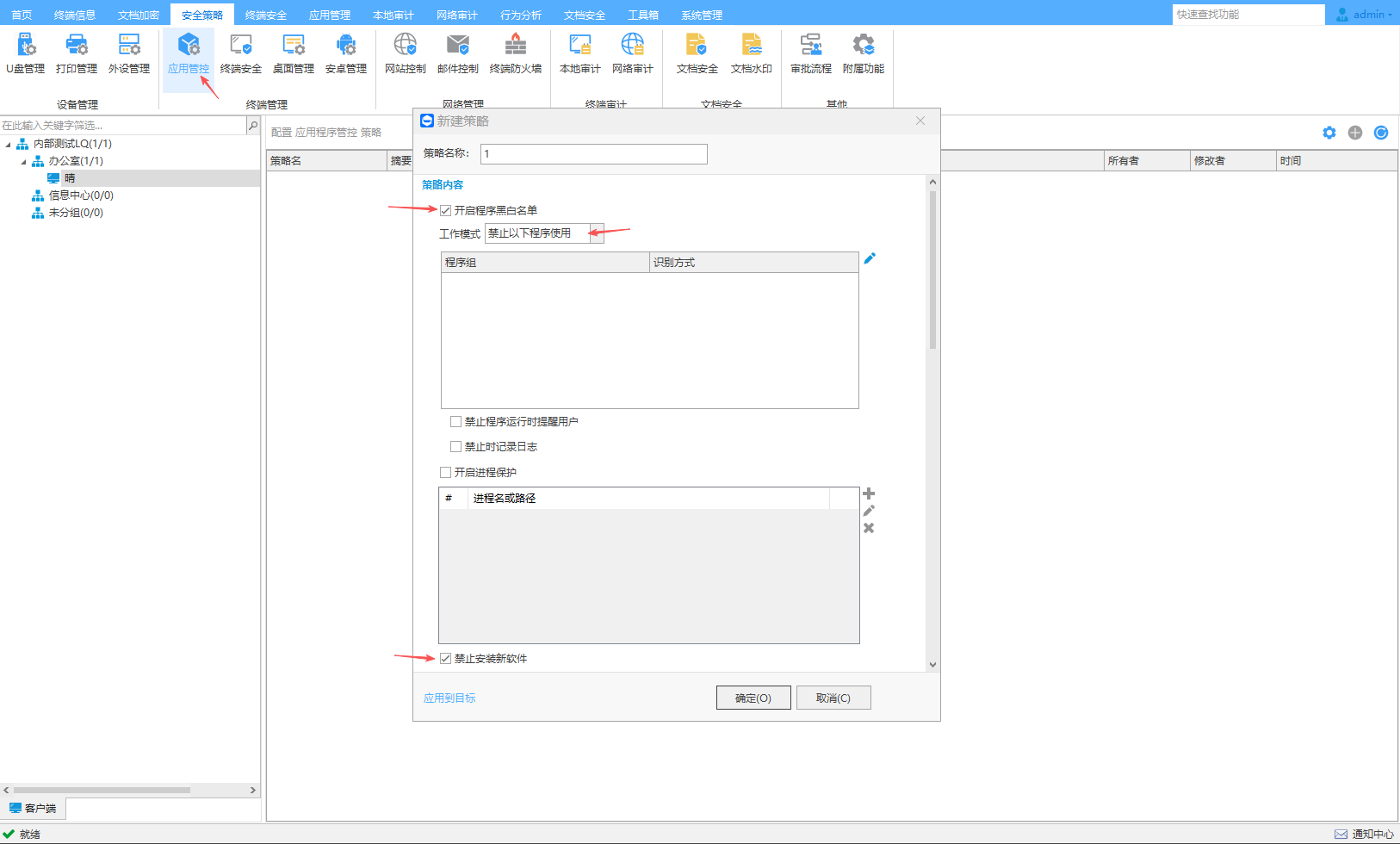 可以规定终端不能使用哪些程序,如风行、迅雷等,优化工作环境,支持黑名单和白名单模式。可以禁止终端电脑新安装其它软件。详细记录终端电脑使用的各类应用程序,包含应用程序名称及使用时间、使用时长。细记录终端电脑安装、卸载软件的操作。自动收集全网所有使用过的应用程序信息,包含软件名字、公司名称、版本、大小、描述及使用频率等,同时支持自动归集分组管理