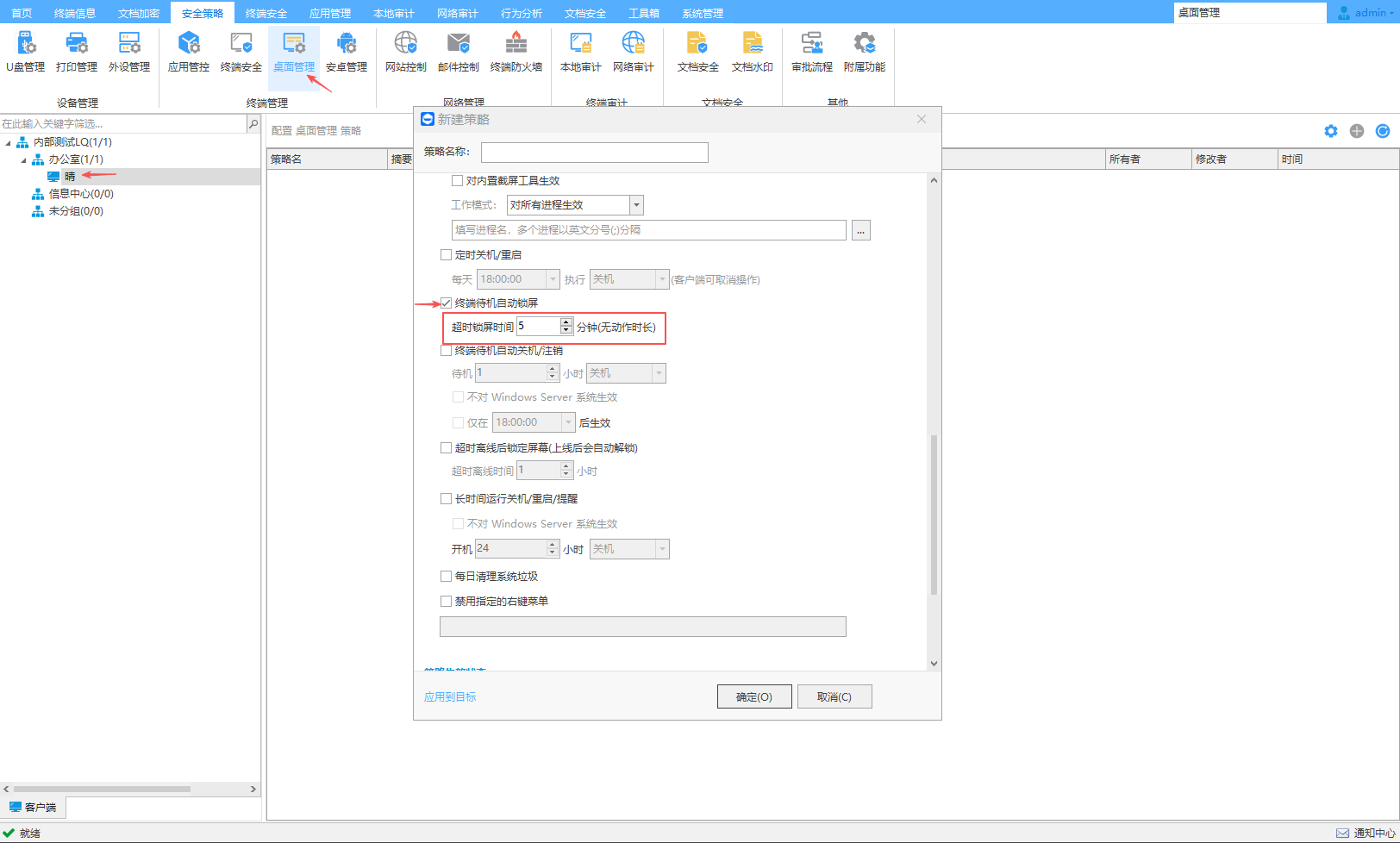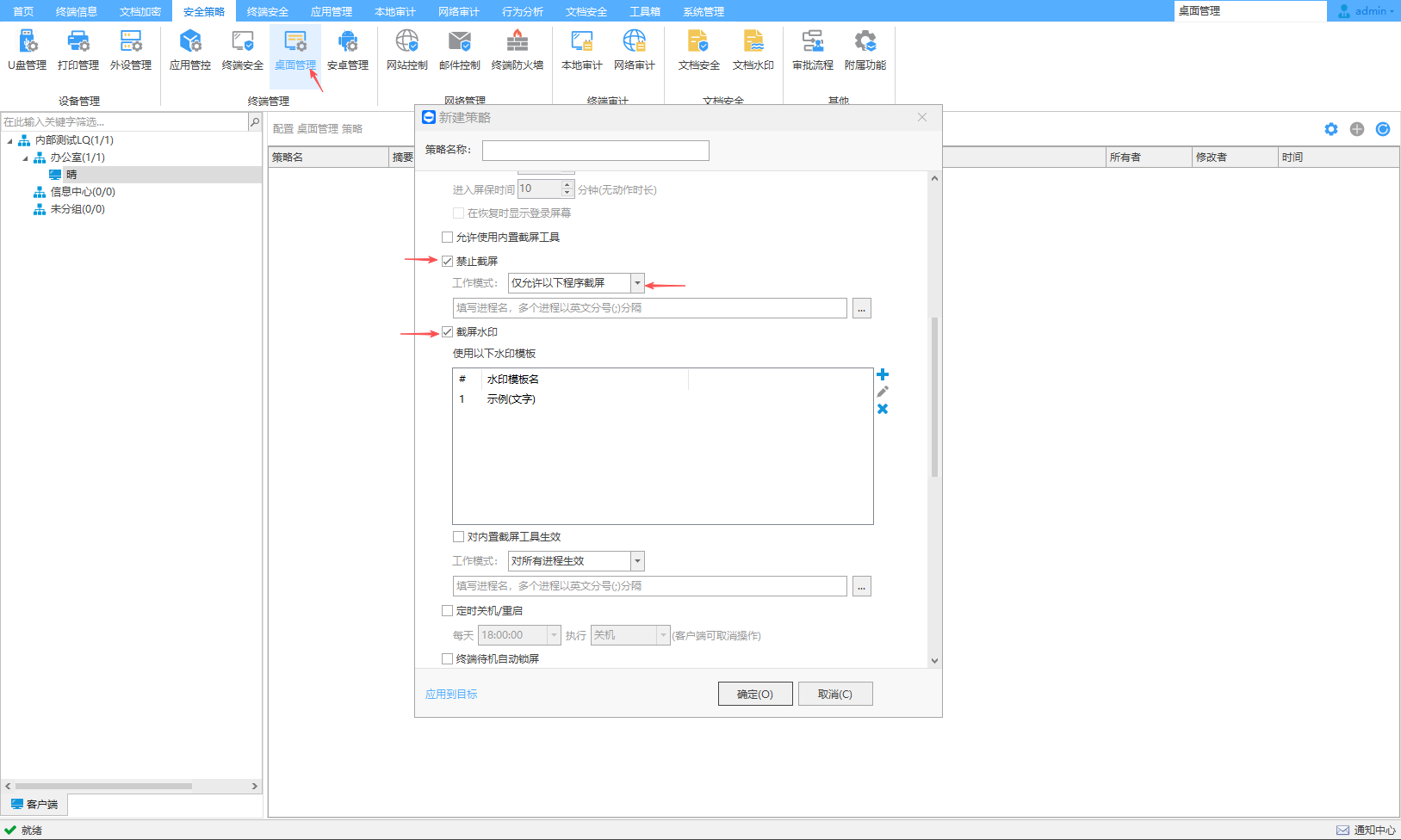 可以设置终端电脑屏幕上实时显示水印,支持关键字、字体、颜色、透明度、倾斜角度、IP地址、计算机名称、MAC地址和时间等设置