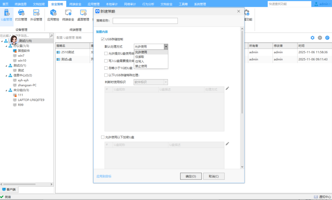 u盘管理:u盘管理:灵活管理USB设备使用(禁用/启用、只读/可写),并阻止非公司授权设备。同时,通过精细权限控制,确保指定用户或部门按需使用设备,保障安全同时提升办公效率。