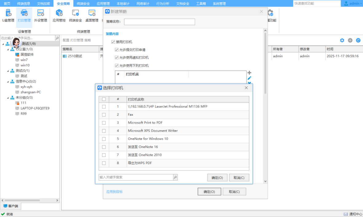 打印机管控:禁止终端电脑在指定进程下使用打印机,同时禁用虚拟打印机。若终端被限制使用打印机,用户可向管理端提交申请。