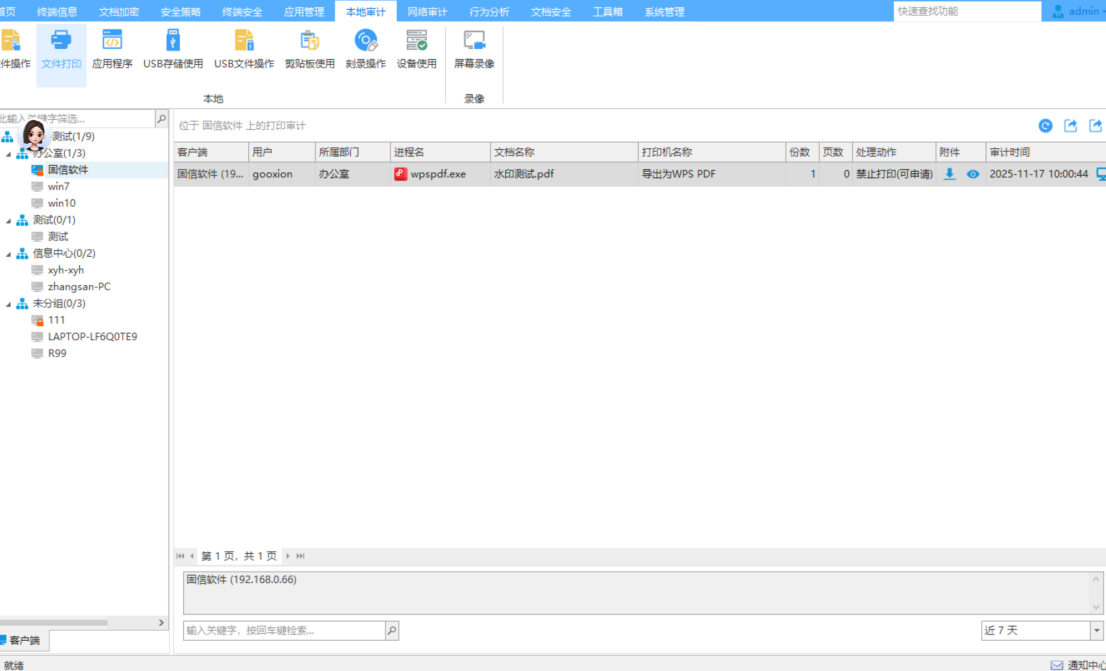 打印文件监控:系统支持对所有终端计算机文件打印操作进行监控记录,支持本地打印、网络打印及虚拟打印等多种打印方式,支持记录打印文件名称、目录、打印页数及文件内容等监控内容。