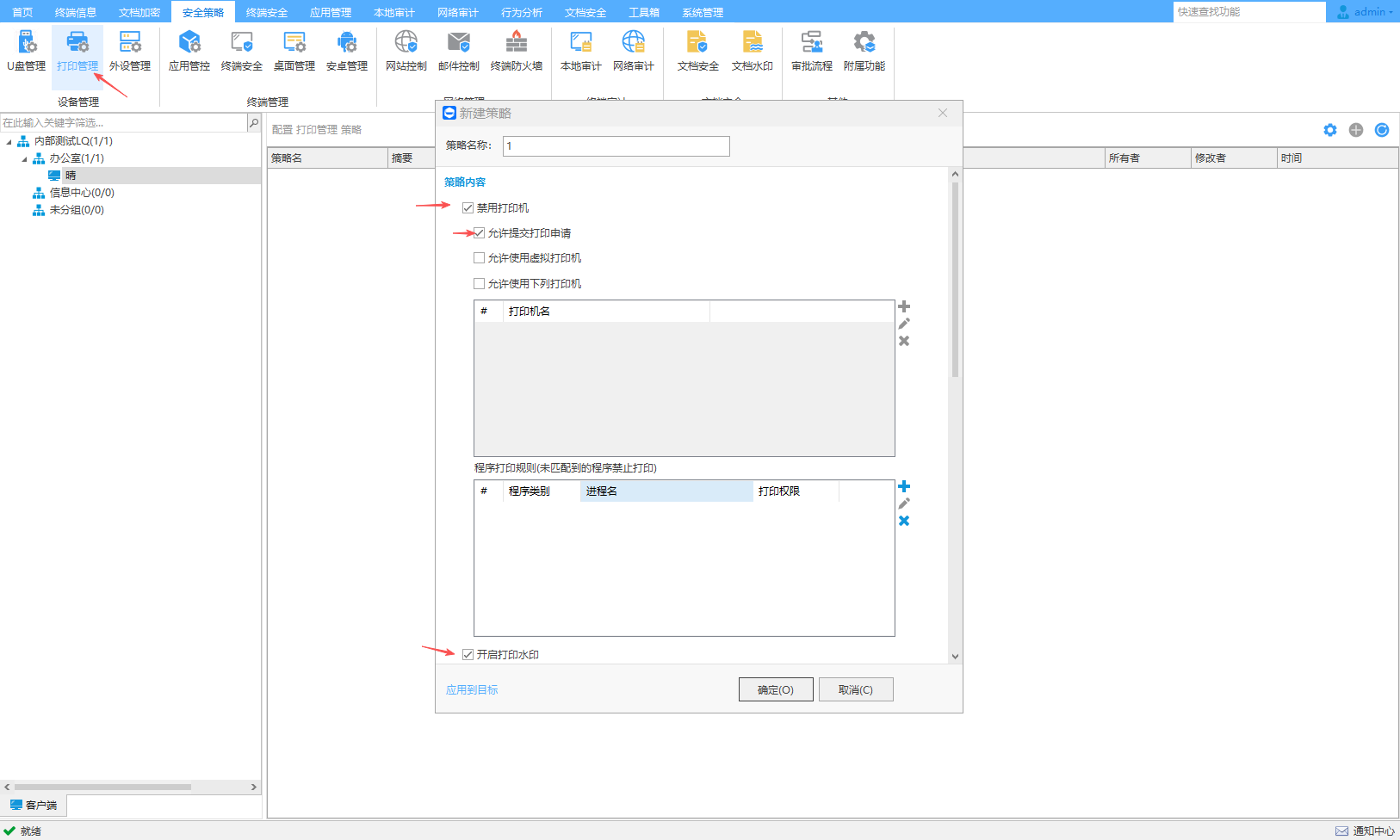 可以禁止终端电脑不能使用打印机、不能使用虚拟打印机、可以正常使用哪些打印机。打印文件显示水印信息,支持关键字、字体、颜色、透明度、倾斜角度、IP地址、计算机名称、MAC地址和时间等设置。详细记录终端电脑打印文件的操作,包含文件名、打印机名称、打印页数,哪些打印机只能打印哪些纸张大小的文件等。