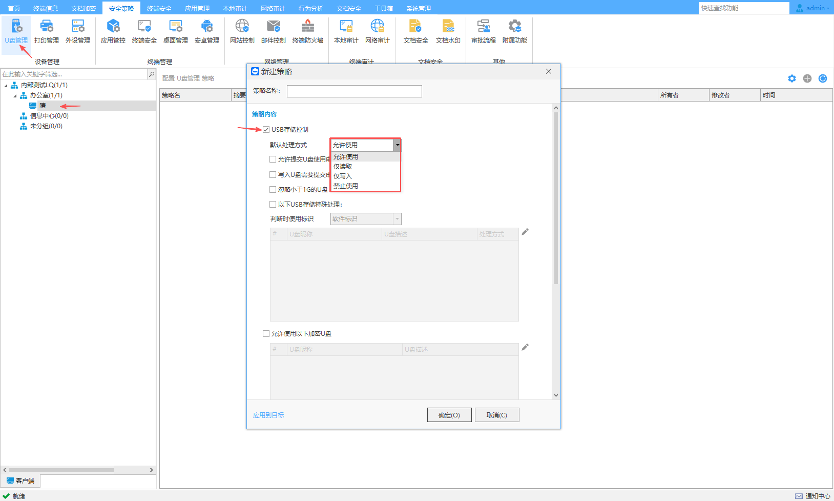 U盘提供支持禁用,只读,只写和加密4种管控模式,只写模式下禁止终端计算机读取U盘内所有内容,预防U盘病毒侵害终端计算机,全面记录U盘使用及文档操作记录。