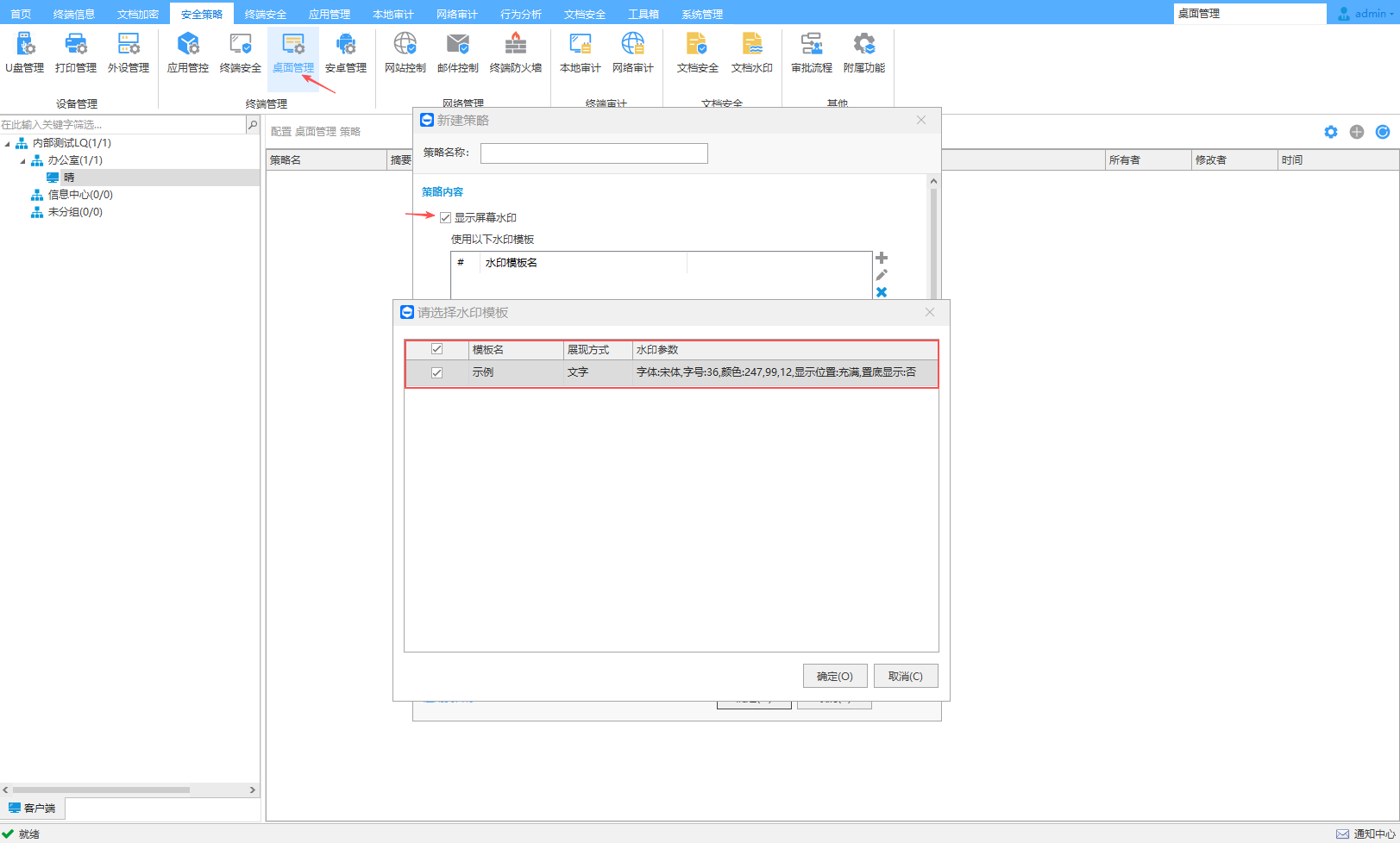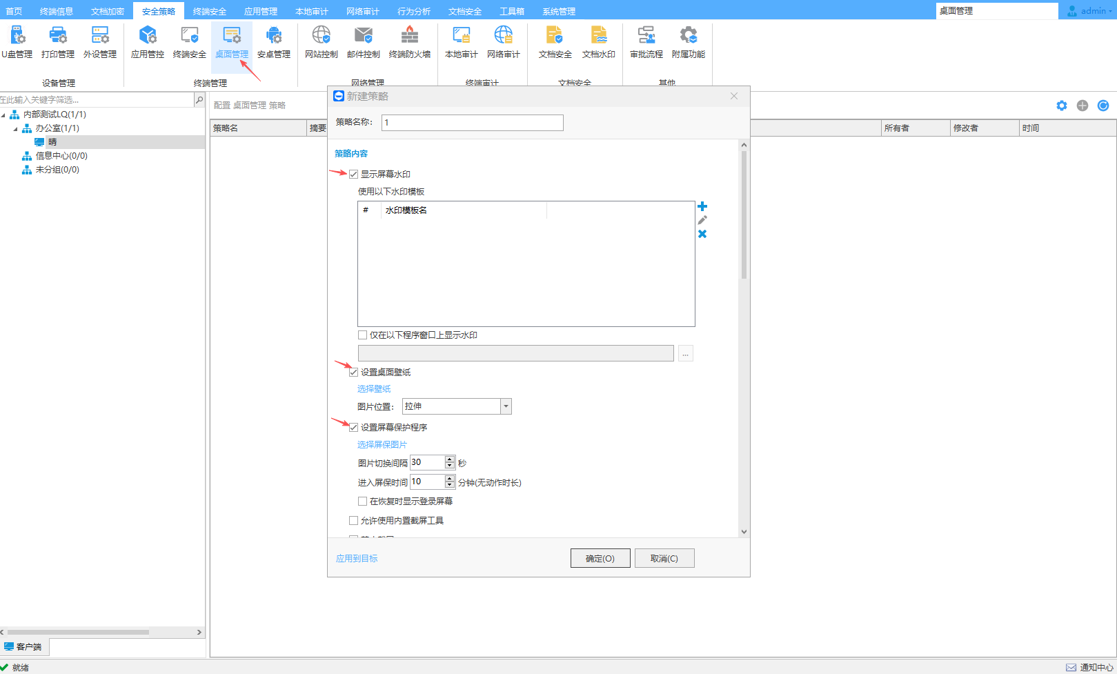 可以设置终端电脑屏幕上实时显示水印,支持关键字、字体、颜色、透明度、倾斜角度、IP地址、计算机名称、MAC地址和时间等设置